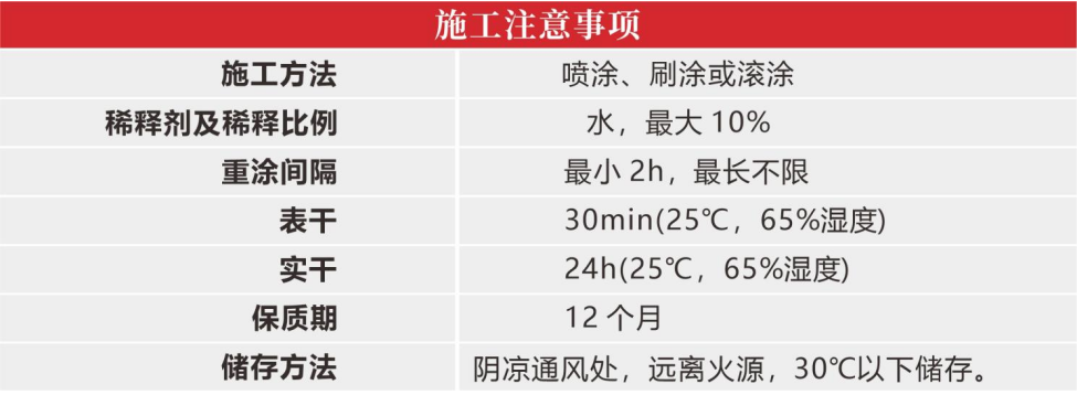 4、施工注意事項(xiàng):雨天或過(guò)度潮濕天氣禁止施工,保持施工環(huán)境的空氣流通;過(guò)度加水稀釋會(huì)增加涂裝風(fēng)險(xiǎn),并容易產(chǎn)生遮蓋力不足、漆膜不夠豐滿等問(wèn)題,最終會(huì)降低涂膜 綜合性能,所以一次成膜不能太厚,建議單遍干膜厚度為30μm。