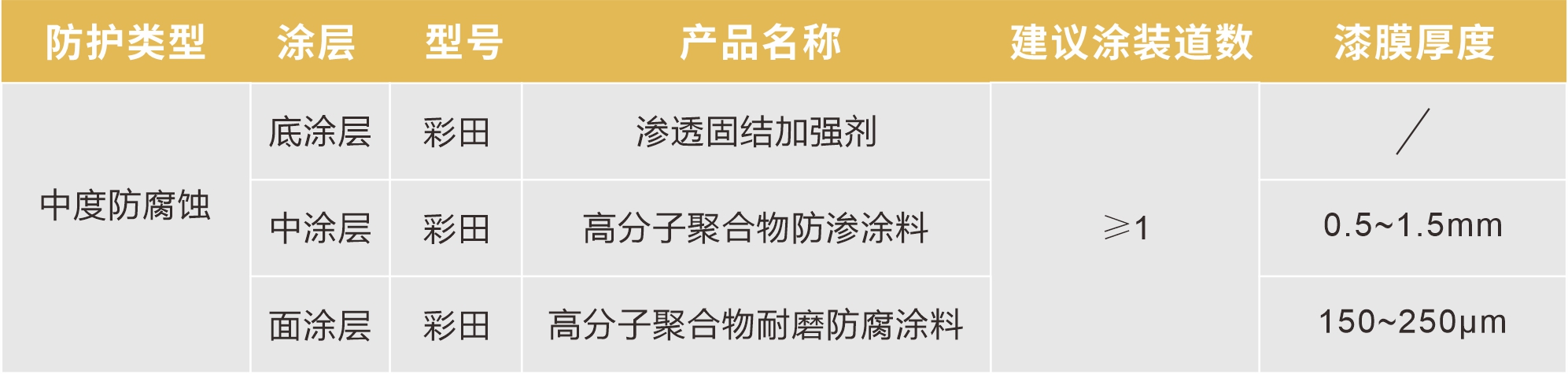 彩田高分子聚合物耐磨防腐涂料由改性環氧樹脂乳液、聚酰胺為基料,配以著色顏料、耐磨助劑、體質顏料等組成的高耐久雙組分環氧面漆。